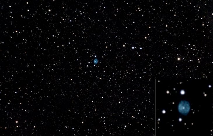 William Herschel entdeckte 1784 den Planetarischen Nebel NGC 6905 im Sternbild Delfin. Das Inset (3x Drizzle) zeigt feine Details in diesem sogenannten Blue Flash Nebula (Daten)