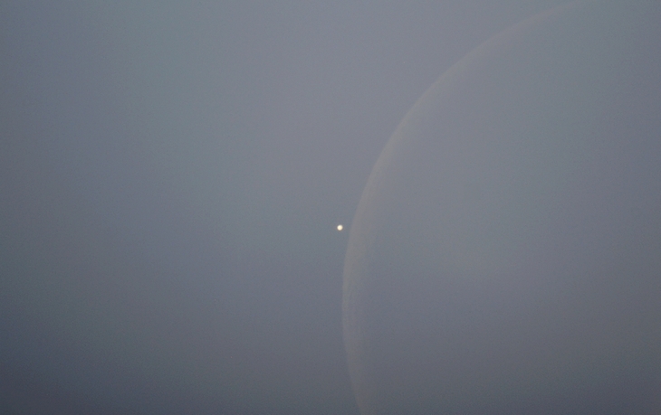 Stunden nach dem Rendezvous (s.u.) bedeckte der alte Mond die Venus am hellen Taghimmel. Ich filmte das Ereignis. Oben sehen wir die Venus eine gute Minute vor der Bedeckung (Daten)