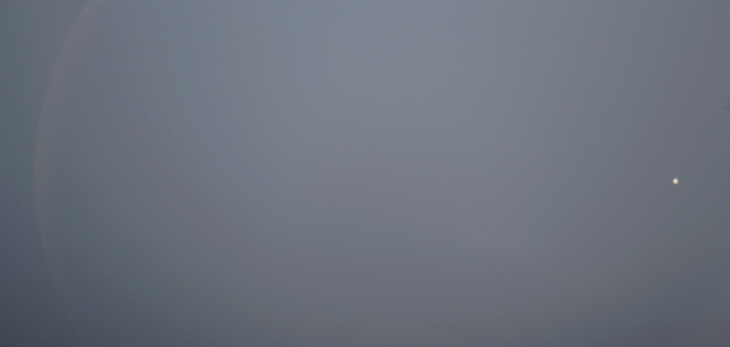 Mondfinsternis am 7.9.2025, 20:05 MESZ: Anfangs ist der total verfinsterte Mond kaum in der nautischen Dämmerung auszumachen. Er steht bloß 6 Grad hoch: starke Extinktion (Daten)