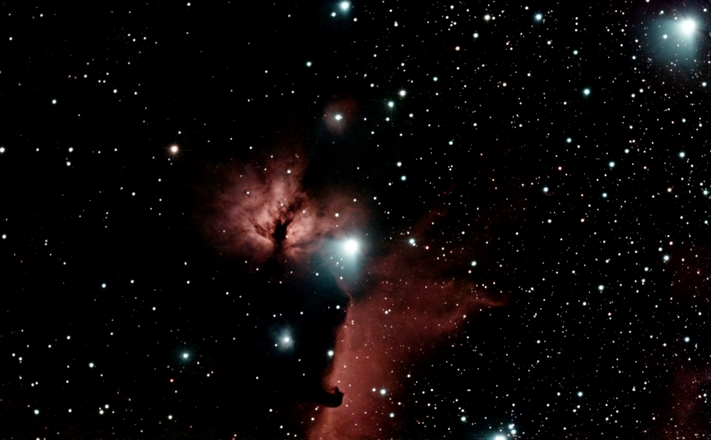 Etwas ungünstig geframt: Links der Mitte der Flammennebel (NGC 2024), unten der Pferdekopfnebel (IC 434). Wir sehen angeregten Wasserstoff und Dunkelwolken (Daten)