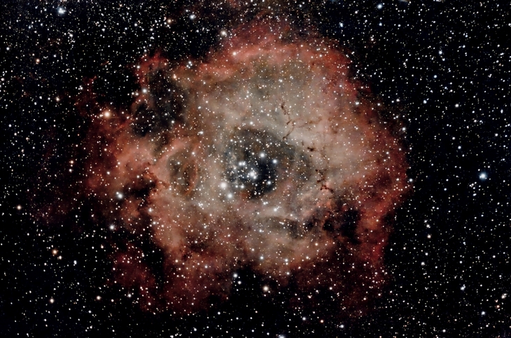 Der Rosettennebel mit dem eingebetteten Sternhaufen NGC 2237 im Sternbild Einhorn - wenigstens am Himmel existiert dieses Fabelwesen (Daten)