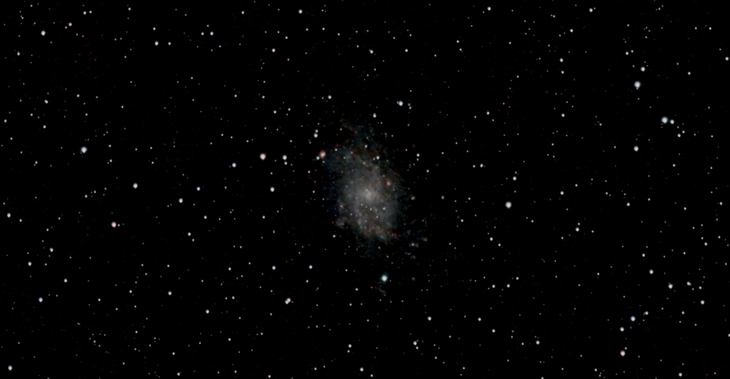 Die Galaxie M33 ist bloß 2,8 Mio. Lichtjahre entfernt. Galileis Schüler Giovanni Battista Hodierna fand diesen sogenannten Dreiecksnebel. Darin sieht man rötliche Sternentstehungsgebiete. Die hellsten: NGC 604 (Wilhelm Herschel, 1784) und NGC 595 (Heinrich Louis d’Arrest, 1864) (Daten)