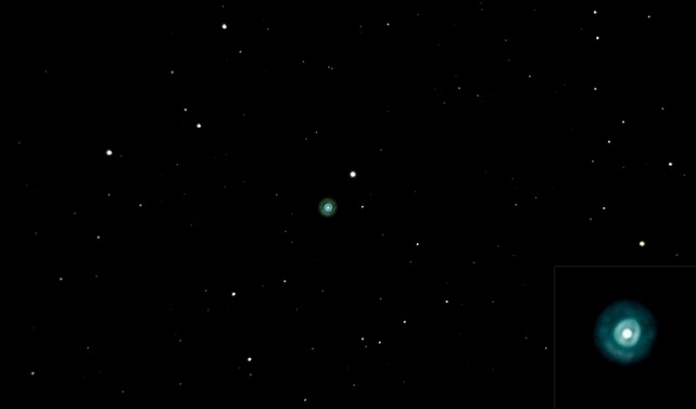 Der auch als Saturnnebel bekannte NGC 7009, ein Planetarischer Nebel - entdeckt1782 von William Herschel im Wassermann. Rechts unten eingeblendet mit 3facher Drizzle-Vergrößerung.