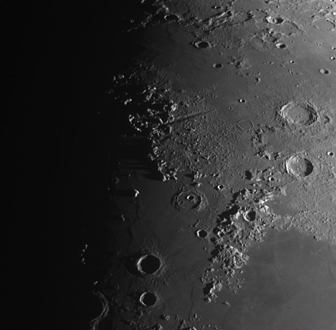 Das Mare Nectaris (Nektarmeer) auf dem Mond. Im Norden ("oben") liegt der fast ganz von Lava bedeckte "Geisterkrater" Daguerre (2.5.2025, Meade LX90, Asi 678MC, Asi IR-Filter 850 nm)