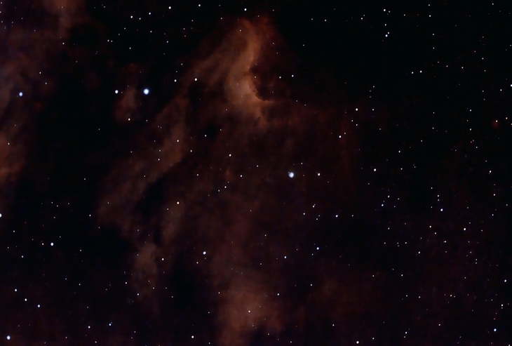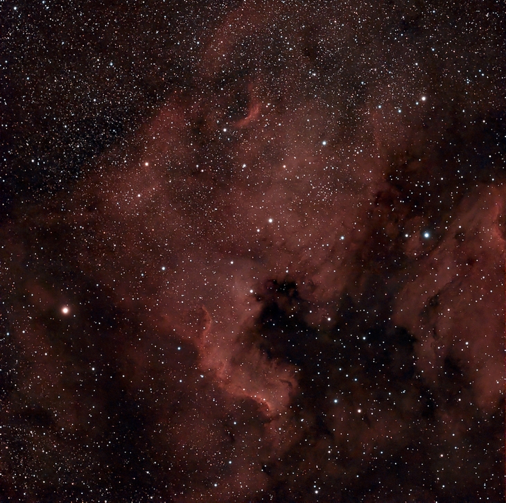 NGC 7000, der Nordamerikanebel. Die rote Farbe dieses Gasnebels - er schimmert sehr schwach im Sternbild Schwan - stammt vom Wasserstoff (Daten)