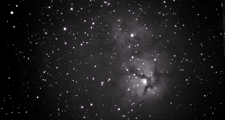 M20, der Trifidnebel im Schützen (trifidus, lat.: „dreigeteilt"). Eine Dunkelwolke aus Staub teilt ihn scheinbar in drei Teile. Jedoch: Wo ist seine Farbe hin?