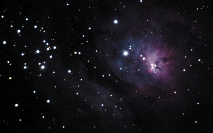 Der Sternhaufen NGC 6530 (links) regt das Gas des M8 zum Leuchten an. Das Licht des südlichen Sternbilds Schütze muss "durch ganz Wien", bevor ich es einfangen kann.