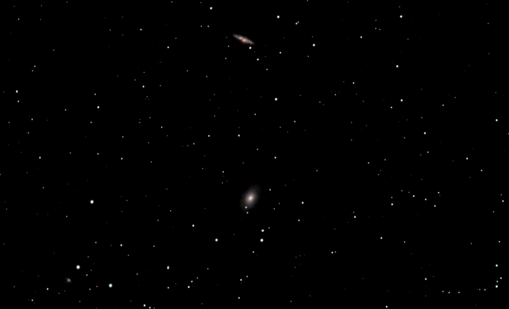 Die Galaxien M81 (Mitte) und M82 (oben) wurden 1744 vom deutschen Astronomen Johann Elert Bode entdeckt. Sie sind gravitationell aneinander gebunden (Daten)