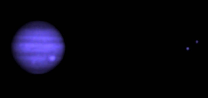 Einen höchst unvertrauten Anblick - mehr hoch als breit - bietet der Planet Jupiter im IR-Methanband. Rechts erblickt man die Monde Io und Europa