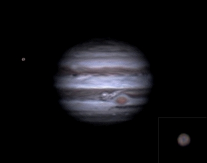 Am 2.10.2022 zog Jupitermond Europa (hier ist bloß der Schatten sicher erkennbar) vorm Großen Roten Fleck vorbei. Leider sehr schlechtes Seeing. Links Ganymed, rechts Io.