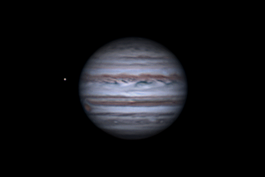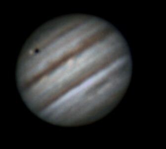 Jupiter am 28.4.2016. Der Mond Ganymed (rechts, mit Detail!) wirft seinen Schatten auf den Planeten.