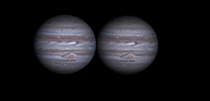 I've looked at clouds from both sides now: "Vorne" der Große Rote Fleck, "hinten" die Störung im südlichen Äquatorialband (4. u. 5.2.2025, LX90, Asi 678MC)