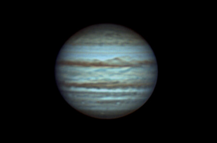 Das Seeing - wohl um 1,2" - halbiert die theoretische Auflösung meines Teleskops leider. Daher wirken die Details auf dem Jupiter trotz allem grob.