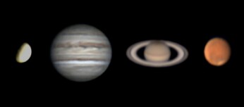 Venus, Jupiter, Saturn, Mars im gleichen Maßstab - aus vier Fotos, die in der Nacht vom 20. zum 21.6.2018 entstanden