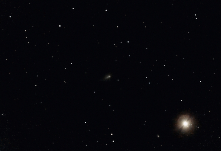 Der grünliche Kopf des Pons-Brooks im Teleskop. Am 31.3.2024 stand dieser Komet in der späten Abenddämmerung neben dem leicht rötlichen Widderstern Hamal (Einzelfoto mit ISO 800)