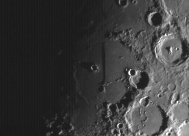 Diese Rimae Petavius zeigt sich hier als feiner, dunkler Strich (rechts)