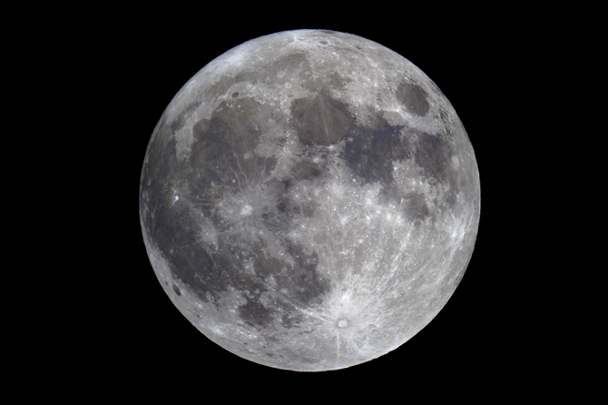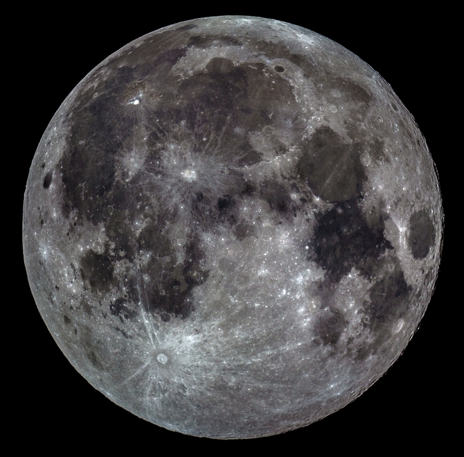 Älteres Panoramafoto neu "entwickelt": Die Strahlensysteme und anderen hellen Strukturen sind wesentlich jünger als das Gros der Mondoberfläche (1.12.2020, Canon 550D, Meade LX90)