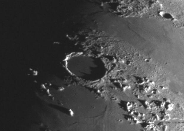 Der gut 90 km weite Mondkrater Copernicus (unten) besitzt mehrere Zentralberge und einen terrassenförmigen Wall. Der Rotfilter Baader 610 reduzierte die Luftunruhe beim Filmen.