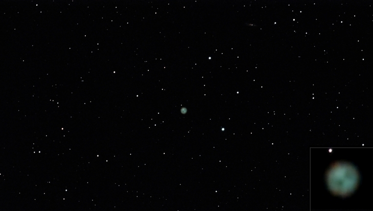 M97, der Eulennebel im Großen Bären, ist ein Planetarischer Nebel. Entfernung 2.600, Durchmesser 2 Lichtjahre. Inset: dreifach gedrizzelt und vergrößert (Daten)