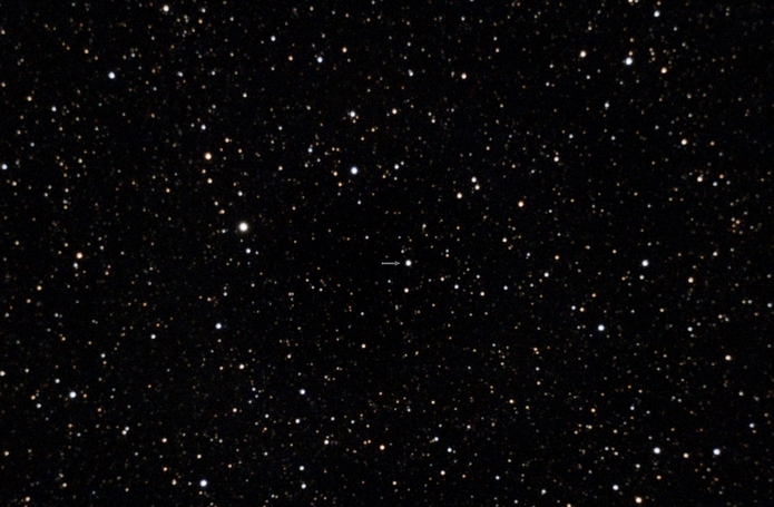 Gaia BH3 im Adler: Der Stern (11 mag) nahe der Bildmitte umrundet alle 11,6 Jahre ein stellares Schwarzes Loch. Erddistanz: knapp 2.000 Lichtjahre (Daten)