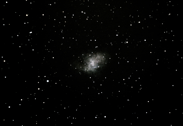 Der Supernova-Überrest M1 aus dem Jahr 1054 (das Wölkchen rechts oben) weilt unweit des hellen Stiersterns Zeta Tauri (f = 500 mm)