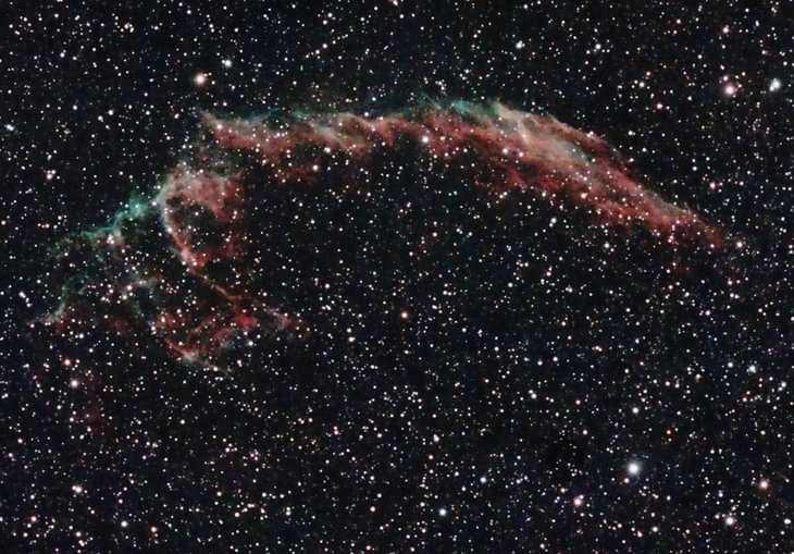 NGC 6995, der Schleiernebel, ist Teil eines Supernova-Überrests im Schwan: Eingefangen mit 500 mm Brennweite und einem UHC-Filter. Hier strahlt v.a. doppelt ionisierter Sauerstoff