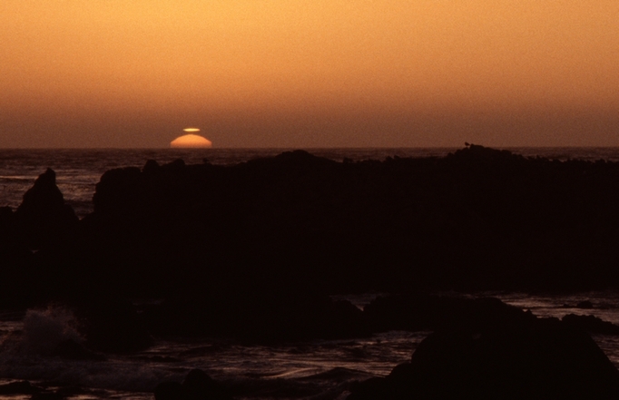 Über dem Meer treten Verzerrungen besonders deutlich auf, wegen des extrem niedrigen Landschaftshorizonts. Da mag sich das Bild eines Gestirns sogar in Teile spalten
