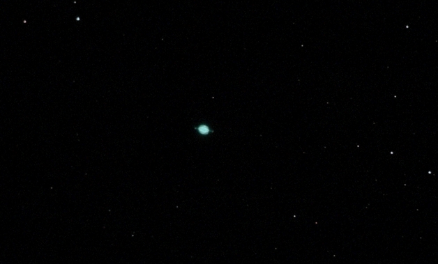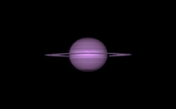 Der kleine Saturnmond Mimas ist wegen der Überstrahlung durch den Ring schwer zu fotografieren. Hier gelang es ausnahmsweise. Wir erspähen ihn im Kreis von Mondkolleginnen. Der Enceladus stand mit 0,4" leider zu nahe an der Tethys, um im Bild aufgelöst zu werden (Daten)
