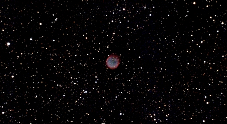 Der NGC 6781 ("Schneekugelnebel"), ein Planetarischer Nebel im Adler, überrascht mit dem Rot des angeregten Wasserstoffs. Verantwortlich: Der ultraheiße Zentralstern (110.000° C) (Daten)