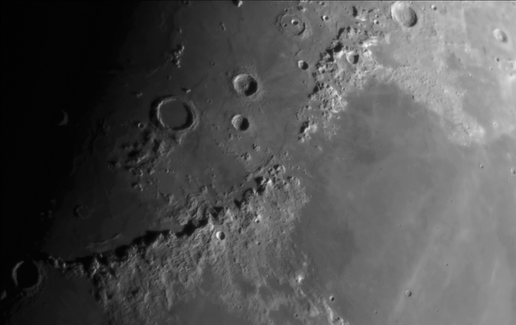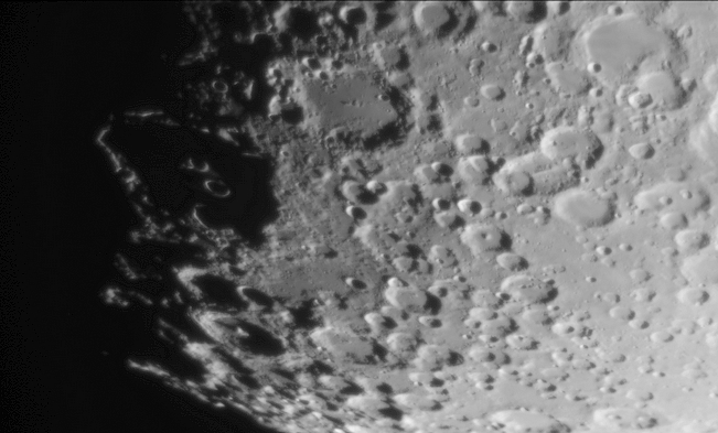 Alpenglühen im Mondkrater Clavius (links oberhalb der Bildmitte), der hier weit über den Terminator ragt. Der Jesuit ist mit der Gregorianischen Kalendereform verwoben (Daten)