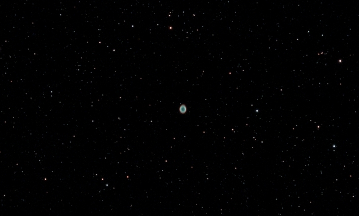 M57, der berühmte Ringnebel im Sternbild Leier ist 20.000 Jahre alt. Zum Leuchten angeregt wird der Planetarische Nebel von einem 70.000° C heißen Zentralstern (Daten)
