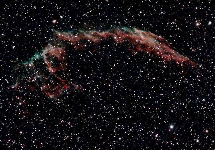 NGC 6995, auch Schleiernebel genannt, ist der östliche Teil eines Supernova-Überrests im Schwan. Alter: 10.000 bis 20.000 Jahre (Daten)