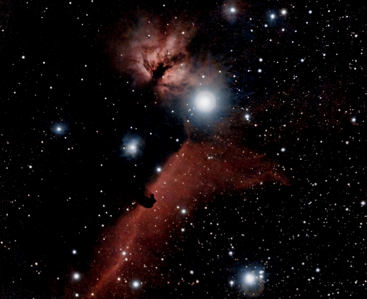 Der Flammennebel (oben) und der Pferdekopfnebel (unten) flankieren den