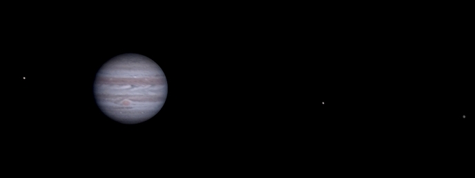 Jupiter mit den Monden Europa und Ganymed (der größere der beiden) und deren gleichzeitigem Schattenwurf auf den Planeten (30.12.2023)
