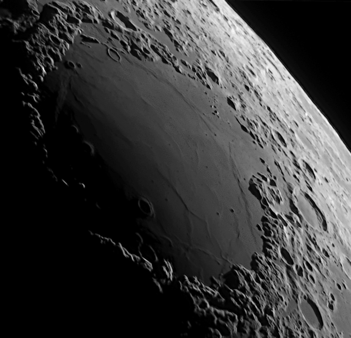 Das Mare Crisium am 2.3.2025 im IR. Neun Stunden zuvor landete die Mondsonde Blue Ghost darin. Man beachte die Verwerfungen, engl. wrinkle ridges genannt (LX90, Asi 678MC, Filter 850)