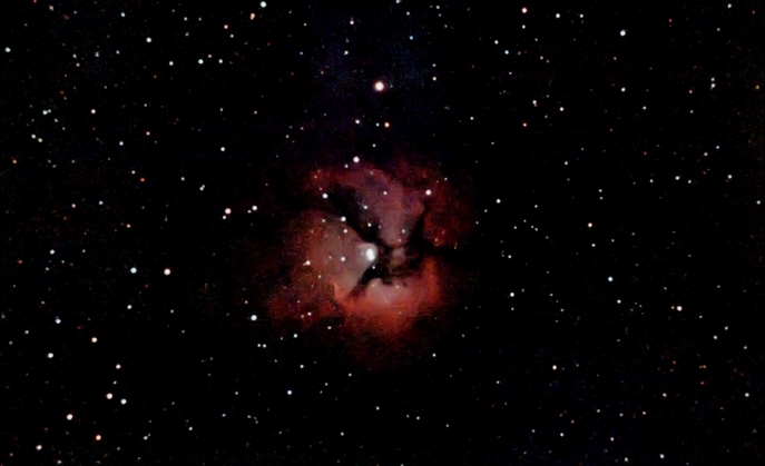 Der Adlernebel, ein Emissionsnebel (IC 4703) samt offenem Sternhaufen (M16) im Sternbild Schlange. Das schlechte SNR erforderte unangenehm starkes Entrauschen (Daten)