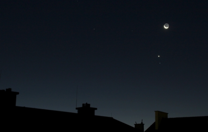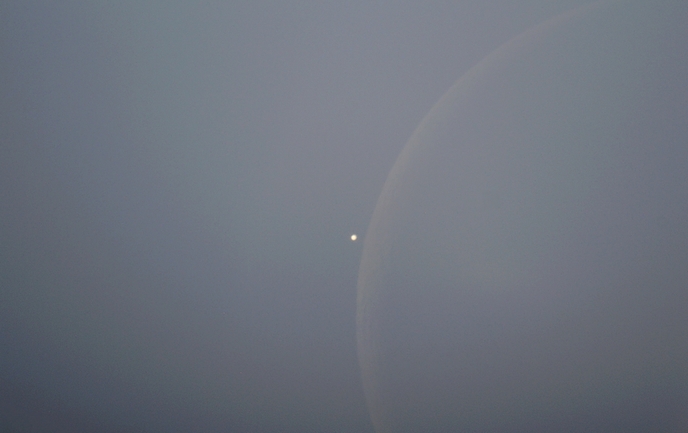 Stunden nach dem Rendezvous (s.u.) bedeckte der alte Mond die Venus am hellen Taghimmel. Ich filmte das Ereignis. Oben sehen wir die Venus eine gute Minute vor der Bedeckung (Daten)