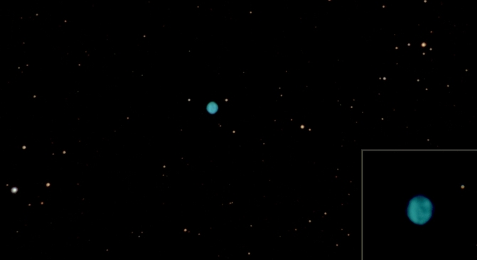 Der auch als Saturnnebel bekannte NGC 7009, ein Planetarischer Nebel - entdeckt1782 von William Herschel im Wassermann. Rechts unten eingeblendet mit 3facher Drizzle-Vergrößerung.
