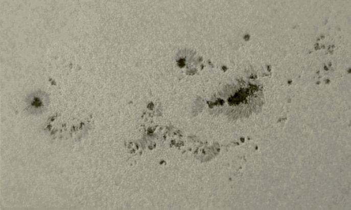 Der große Sonnenfleck am 15.7.2023, mit Umbra und Penumbra. Fotografiert mit der NI5 durch eine fachspezifische Sonnenfilterfolie (Baader AstroSolar).