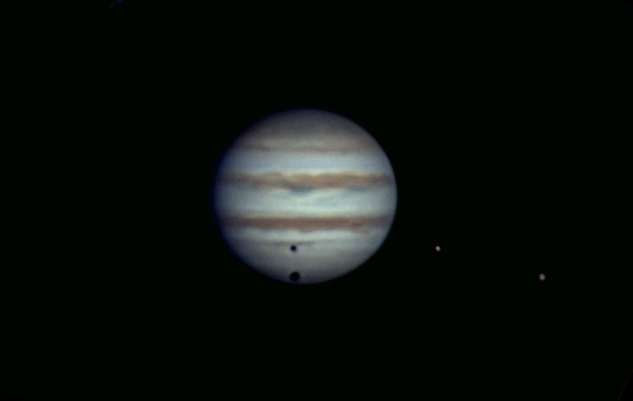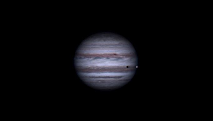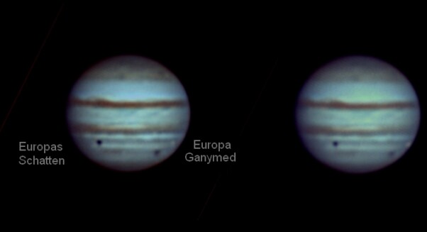 Zwei Monde und zwei Mondschatten gleichzeitig - ein seltenes Zusammenspiel: Leider beeinträchtigt vom schlechten Seeing.