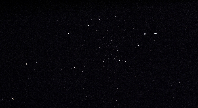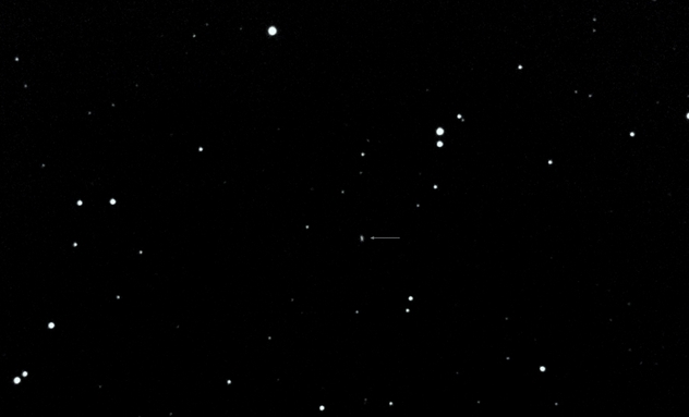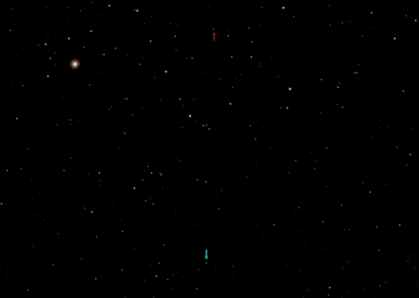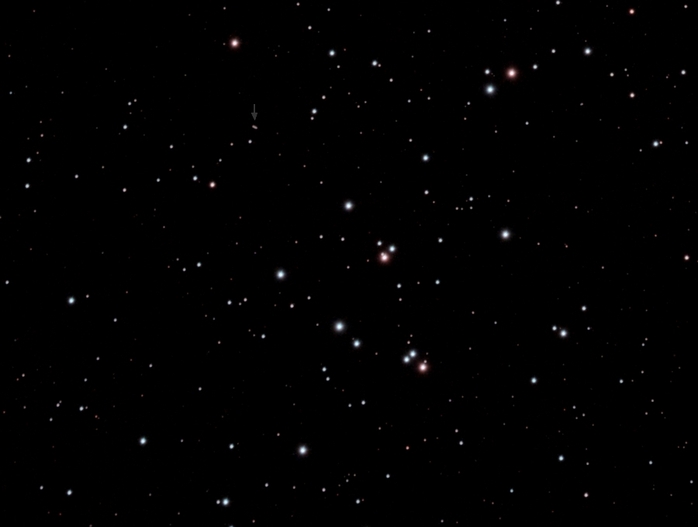 Der Kleinplanet Christine, 1907 entdeckt, 51 km groß und hier in 345 Mio. Erddistanz, verrät sich durch seine Bewegung (Bildmitte)