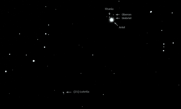Der Kleinplanet (21) Lutetia, entdeckt von Hermann Goldschmidt 1852 in Paris. Hier zieht Lutetia nahe dem Planeten Uranus vorbei, der wiederum vier seiner Monde erkennen lässt