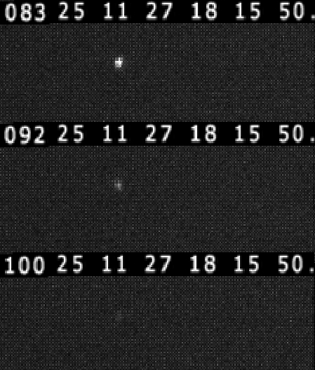 Nur drei Frames eines Videos, gedreht während einer Sternbedeckung durch den Mond, entlarfen Iota Aquarii als sehr engen Doppelstern: Zeitlicher Abstand der Bilder 8 bzw. 9 ms (Daten)