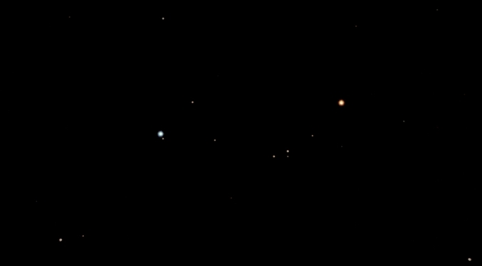 Der Planet Neptun (links der Bildmitte) und knapp darunter sein großer Mond Triton
