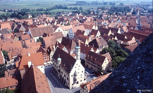 Ruft man sich die brutale Genesis des Ries' in Erinnerung, entsteht ein seltsamer Kontrast zum romantisch-beschaulichen Charakter der alten Gassen Nördlingens. | ![]() |