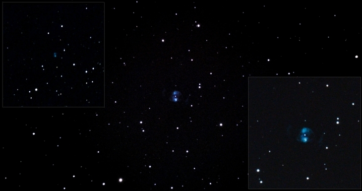Der planetarische Nebel NGC 2371, fotografiert mit unterschiedlichen Brennweiten (links oben 500 mm, sonst 2050 mm) bzw. Vergrößerungen