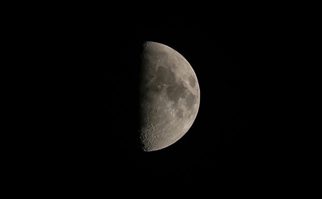 Der Mond im ersten Viertel. Jetzt bilden Erde, Mond und Sonne ein exakt rechtwinkeliges Dreieck im Raum. |