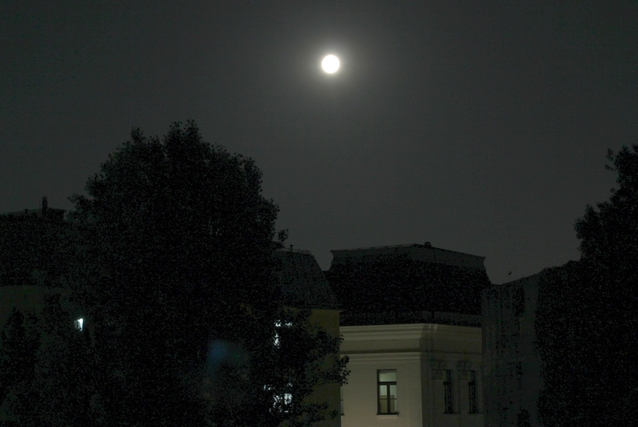 Distanz zur Kamera: 4,8 km (Kirche) bzw. 380.000 km (Mond).