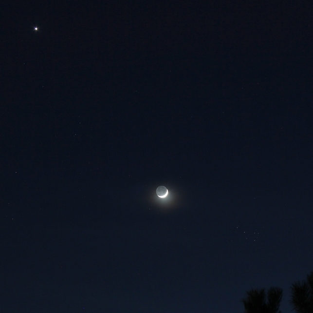 Der junge Mond mit Erdschein weilt abends zwischen dem Sternhaufen der Plejaden (rechts) und der gleißenden Venus (oben)