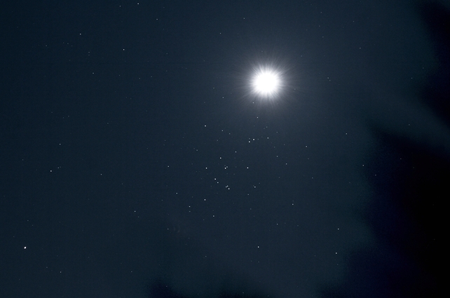 ![]() Venus im Sternhaufen der Plejaden (3.4.2012). Leider stören dünne Wolken. |